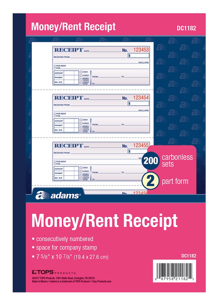 Money/Rent Receipt, 2-Part, Carbonless, 4/PG, 200 ST/BK, (Page Size: 11 x 7.625). Item Number: DC1182.