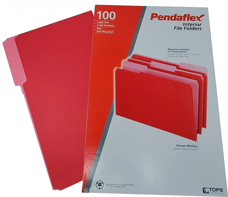 4350 Pendaflex® Interior File Folders Legal PF4350 1/3, 3 Tab Position, Legal Size, 100/Box, PF4350. Classify your papers or documents by subcategory inside Pendaflex Interior File Folders. The bright and reversible selection of color is a great way to designate certain subjects from others or to stands out the most important documents. Folders are legal size (8 1/2" x 14") with 1/3 tab cuts to accommodate most documents. Featuring a reversible two tones by side. These file folders come in a box of 100 to make sure your supply room is set. Create divisions within hanging folders. Specially designed for use with 816 Pendaflex® Legal Recycled Hanging Folders System (816## Pendaflex® Legal Recycled Hanging Folders System, comes in a variety of colors and is sold separately)
