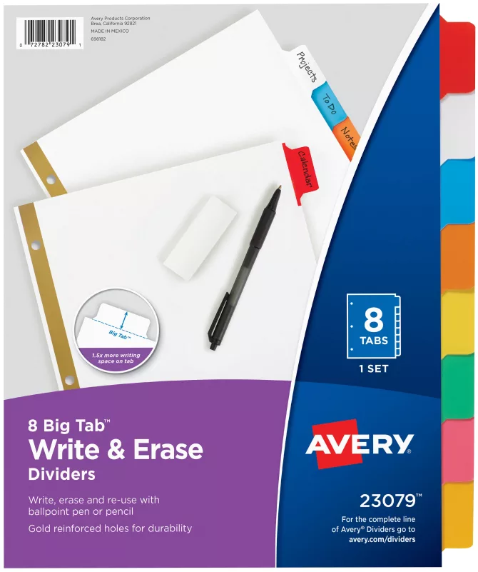 Avery® Big Tab™ Write & Erase Dividers, 8-Tab Set, Multicolor, # 23079
