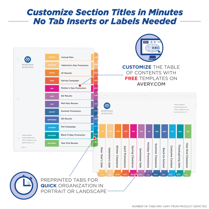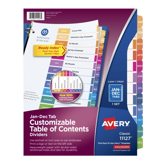 Utiliza el software gratuito de Avery, para crear e imprimir tus propias etiquetas con el template que te brindan. Avery, Ready Index, Monthly Dividers, Customizable Table of Contents, Classic Multicolor Tabs, 1 Set # 11127