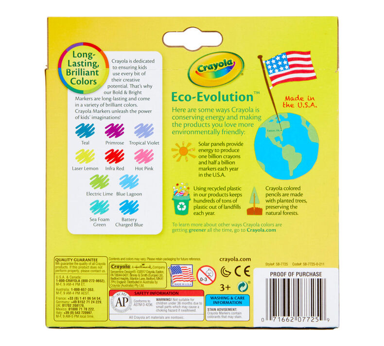 Crayola 10 Broad Line, Bold and Bright Colors Markers, non toxic. Ten Brightest long lasting and brilliant colors. Diez marcadores de duraderos y brillantes colores.