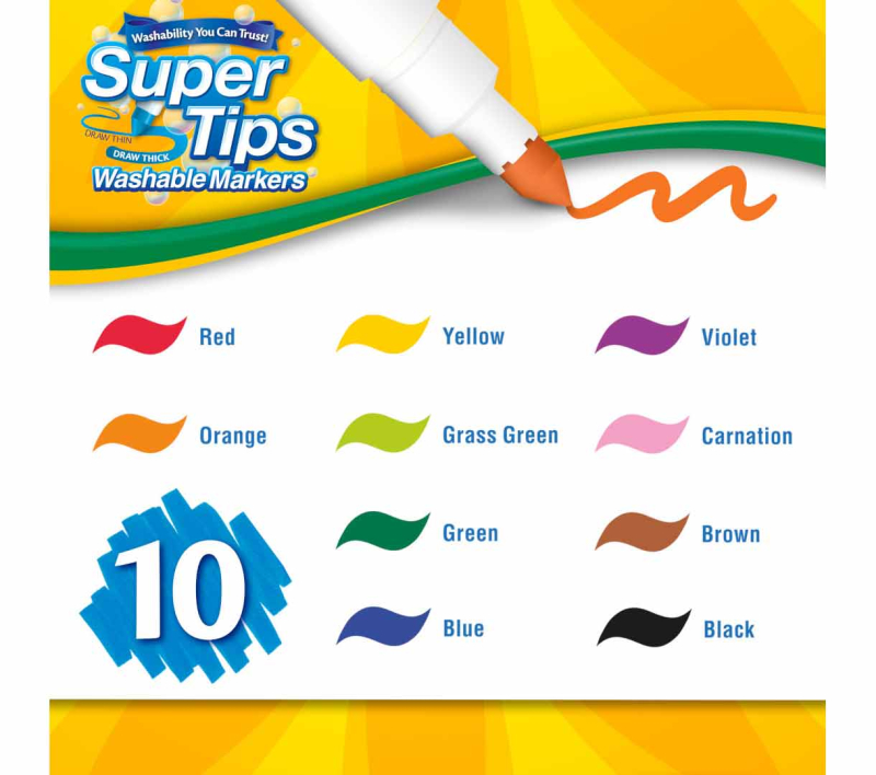 Crayola Super Tips 10 count washable markers. Ten Brightest Basic colors. Nontoxic and washable markers, from hands, clothes and walls. Super Tips Markers are designed to be washable from most fabrics.