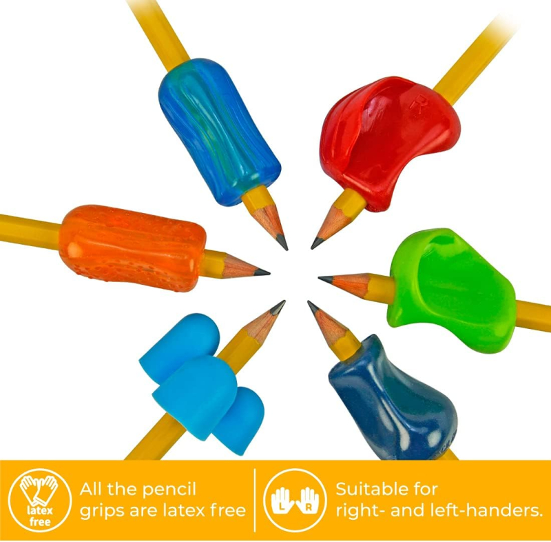 Designed By Doctors - Pencil Grip - For pencils, pens, crayons & many drawing and writing tools. Original Pencil Grip, Crossover Grip, Medium Size Claw Grip. Squishy grips for maximum comfort and control. Excellent for Righties & Lefties. Fits on pencils, pens, crayons & many drawing and writing tools. Fun assortment of vibrant colors. Empuñaduras para lápices premium, ayuda de escritura ergonómica universal para diestros y zurdos, pinzas de lápices coloridos. Varios agarres diferentes, colores surtidos.