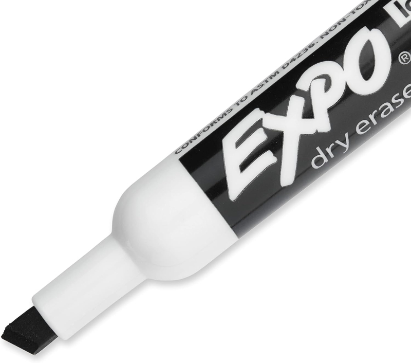 Expo black ink dry erase markers (80661C). Includes 4 markers. Chisel tip. Low odor ink. Ideal for white boards, glass, mirrors or most of non porous surfaces. While erasing, will comes off easy. Marcadores de borrado en seco EXPO de bajo olor. Juego de 4 marcadores en color negro. Para uso en pizarras blancas de borrado en seco, en vidrio y otras superficies no porosas. Secado rápido. Sin manchas.