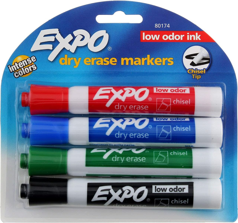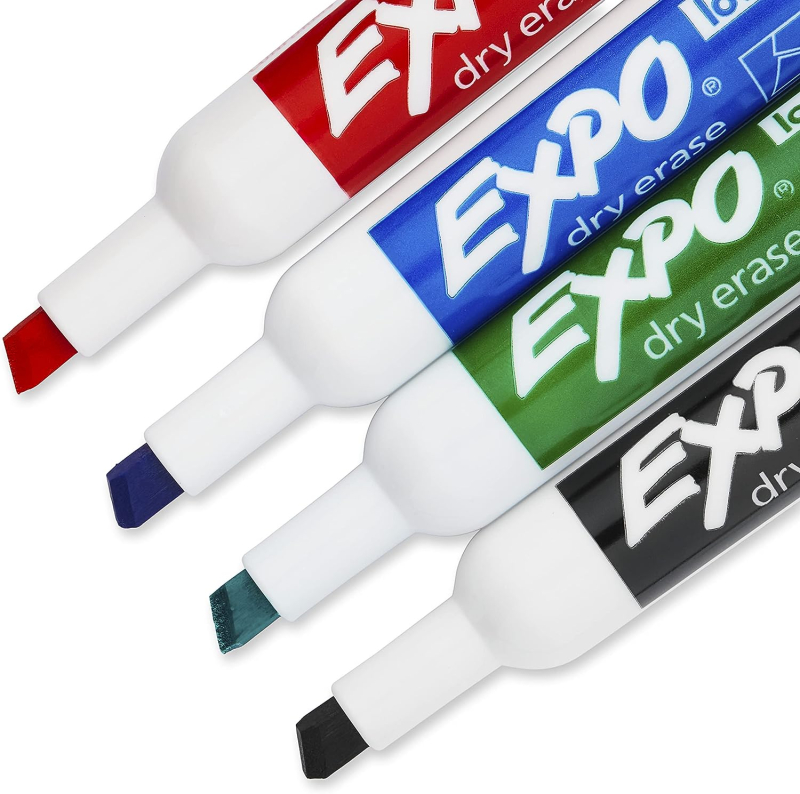 Expo 4 assorted ink dry erase markers (80174). Includes 4 different colors. Chisel tip. Low odor ink. Ideal for White Boards, glass, mirrors or most of non porous surfaces. While erasing, will comes off easy. Marcadores de borrado en seco EXPO de bajo olor. Juego de 4 colores: azul, blanco, negro y verde (paquete de 4). Para uso en pizarras blancas de borrado en seco, en vidrio y otras superficies no porosas. Bajo olor. Secado rápido. Sin manchas.