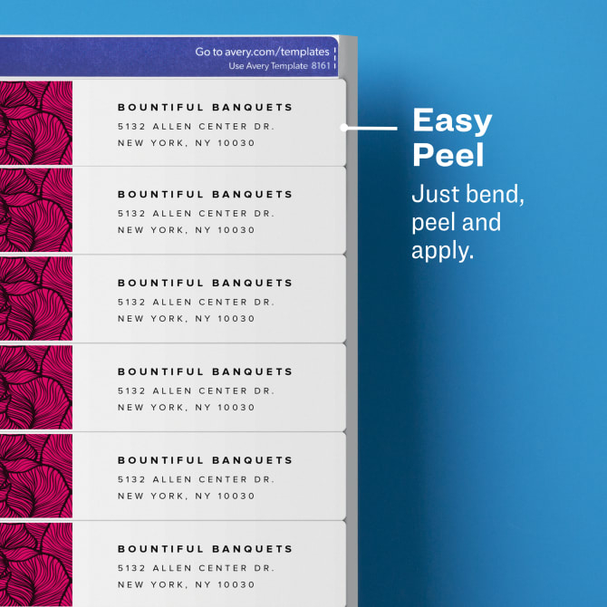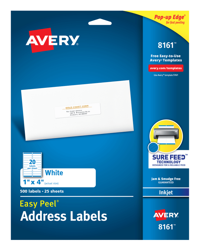 Utiliza el software gratuito de Avery, para crear e imprimir tus propias etiquetas con el template que te brindan. Avery® Easy Peel® Address Labels, Sure Feed™ Technology, Permanent Adhesive, 1" x 4", 500 Labels, # 08161