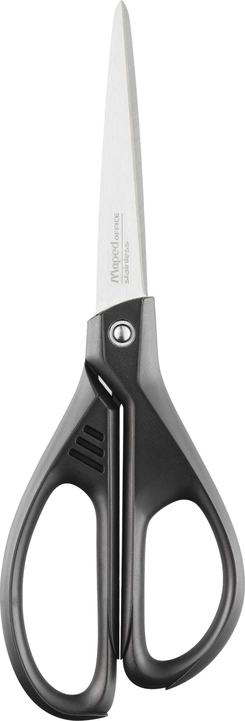 Tijera de oficina de acero inoxidable marca Maped Office Essentials, de tamaño de 8.25 pulgadas, eco amigable, hecha de 60% plastico reciclado.