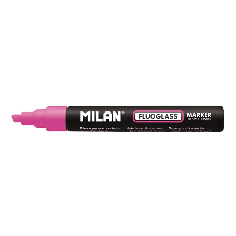 Milan - Blíster Fluoglass punta biselada 2 - 4 mm de color rosa Ref: BWM10389 EAN: 8411574075622 Rotulador para superficies lisas no porosas (ventanas, espejos, pizarras, etc.). Punta biselada 2 - 4 mm. Tinta a base de agua, fácilmente borrable con la ayuda de un paño húmedo. Gracias a la alta concentración de pigmentos los colores se mantienen intensos y brillantes. Color rosa.