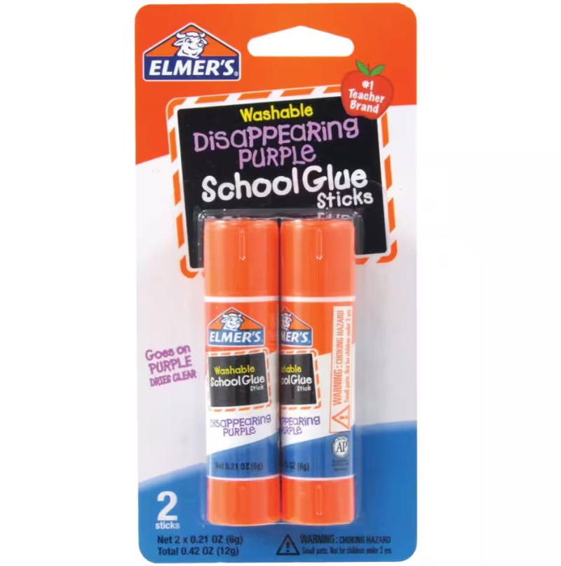 Pegamento en Barra Elmer's School Glue Sticks, Washable Disappearing Purple (paquete de 2). 6 gramos o 0.21 onzas cada uno. Total de 12 gramos por paquete.