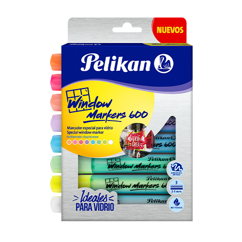 Pelikan Window Markers 600 - Special Glass Window Fast Dry Marker - Marcador especial para cristal o vidrio. Seca rapidamente. Diseño ergonomico para un mejor agarre. Punta biselada indeformable con 3 anchos de linea. Colores vibrantes. Tinta de facil limpieza. Tape al no usarlo y guarde en forma horizontal. Special window marker. Fast dry. Ergonomic body. Non deformable chisel nib. Vibrant colors. Easy cleanup ink. Cover when not in use. Store Horizontally.