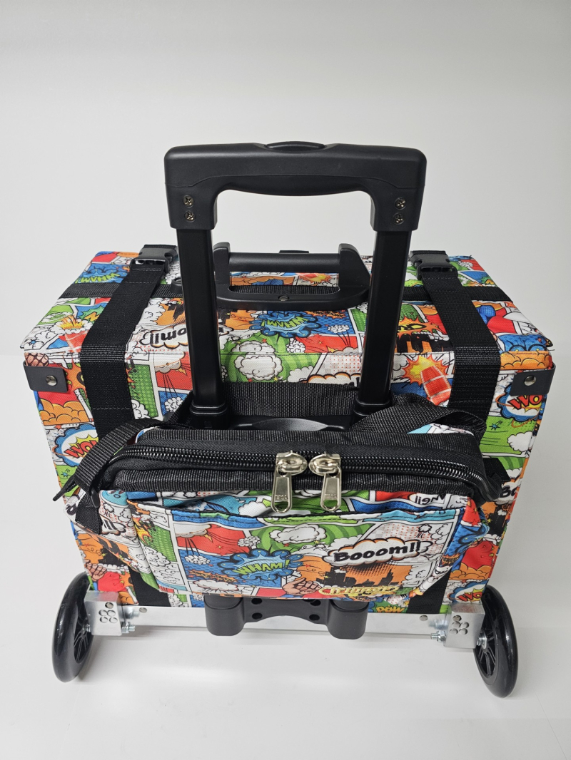 Bulto con ruedas marca Tripper. Hechos en Puerto Rico. Combinación de varios tonos. Cada uno incluye: Una Lonchera con abertura tipo "Wide Mouth" y una cartuchera con hebilla que se adhiere al bulto. Ademas, cada bulto viene equipado con: Dos bolsillos insulados a cada lado. Bolsillos tipo sobre, con zipper al frente. Capacidad de sobre 6 resmas. Correa tipo maleta para colgar cartuchera incluida o un bulto adicional. Sistema "Big Wheel" de dos ruedas grandes traceras para cómodo desplazamiento silencioso y dos ruedas giratorias al frente.
