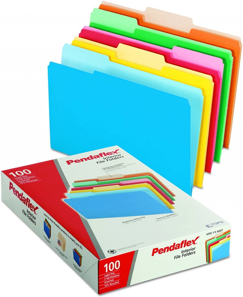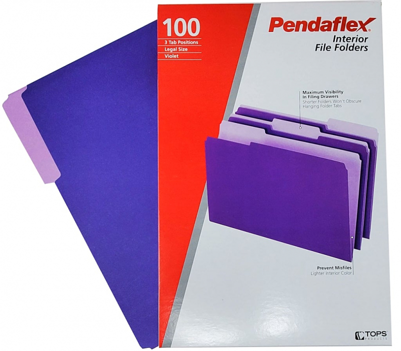 4350 Pendaflex® Interior File Folders Legal PF4350 1/3, 3 Tab Position, Legal Size, 100/Box, PF4350. Classify your papers or documents by subcategory inside Pendaflex Interior File Folders. The bright and reversible selection of color is a great way to designate certain subjects from others or to stands out the most important documents. Folders are legal size (8 1/2" x 14") with 1/3 tab cuts to accommodate most documents. Featuring a reversible two tones by side. These file folders come in a box of 100 to make sure your supply room is set. Create divisions within hanging folders. Specially designed for use with 816 Pendaflex® Legal Recycled Hanging Folders System (816## Pendaflex® Legal Recycled Hanging Folders System, comes in a variety of colors and is sold separately)