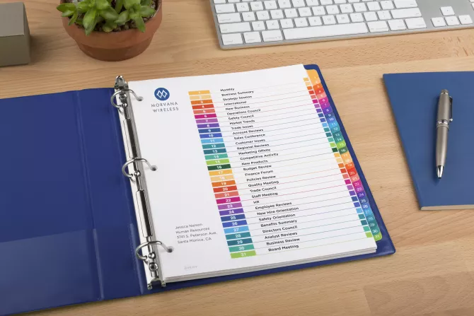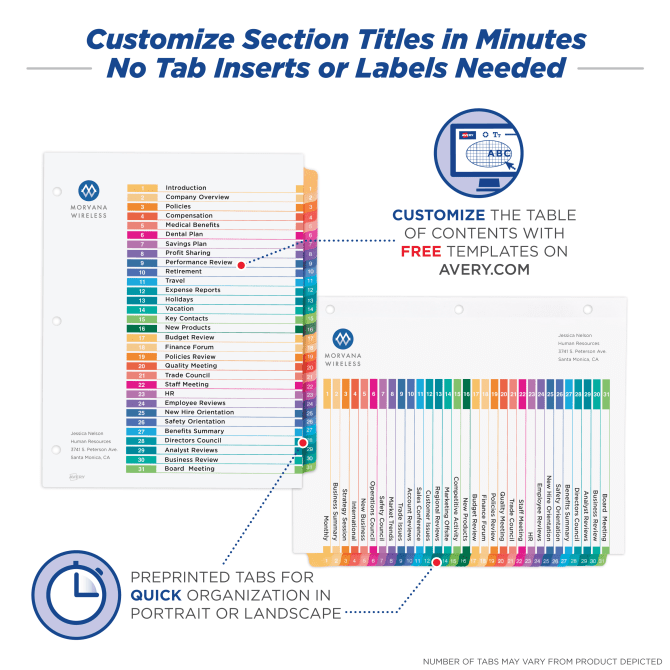 Utiliza el software gratuito de Avery, para crear e imprimir tus propias etiquetas con el template que te brindan. Avery® Ready Index® 31 Tab Binder Dividers, Customizable Table of Contents, Classic Multicolor Tabs, 1 Set # 11129