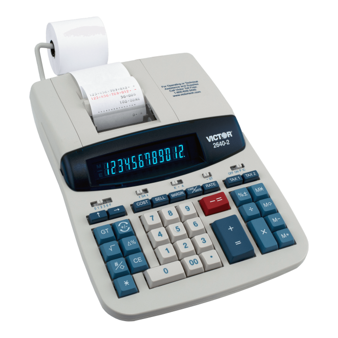 Calculadora con Impresora, Victor 2640-2 ideal para oficina. Medidas11.0 L x 8.0 W x 3.0 H. Es una calculadora, con impresora de escritorio. Imprime 4.6 lineas por segundo en papel 2 1/4". Pantalla de doce digitos fluorescente. Impresora de serie de dos colores. Tinta Victor ink ribbon 7010. Fuente: energia AC.