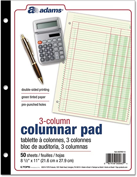 Adams Columnar Analysis Pad 3 Column, 8 1/5" x 11", Double Sided, Green Tinted Paper, Pre-Punched Holes, 50 Sheets, Item Number: ACP85113
