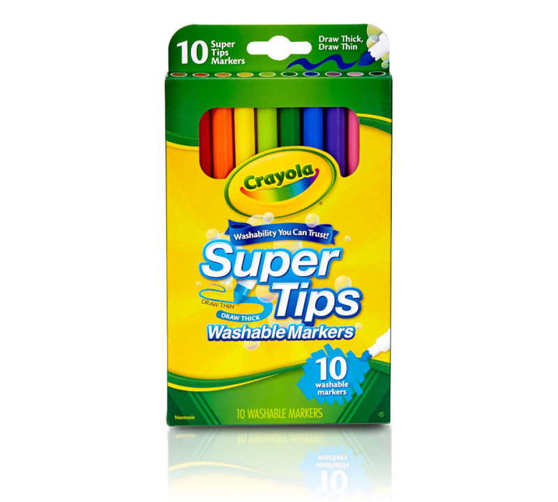 Crayola Super Tips 10 count washable markers. Ten Brightest Basic colors. Nontoxic and washable markers, from hands, clothes and walls. Super Tips Markers are designed to be washable from most fabrics.