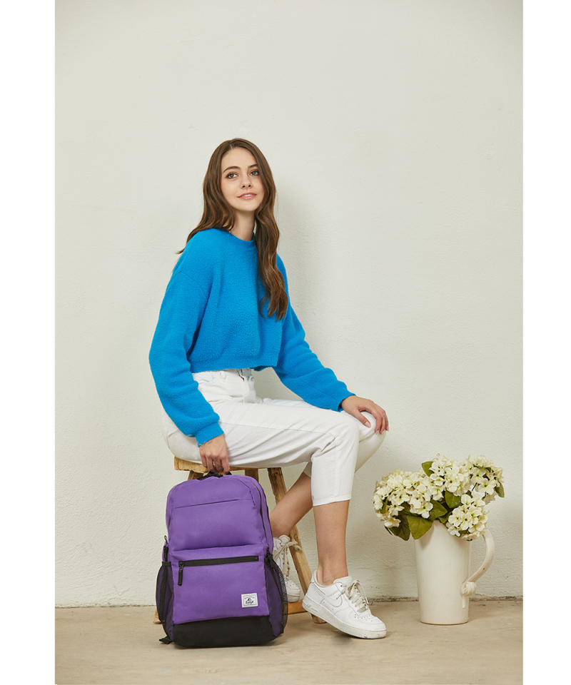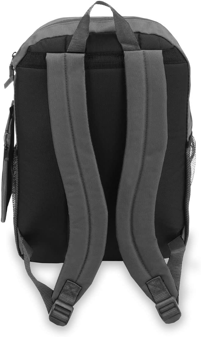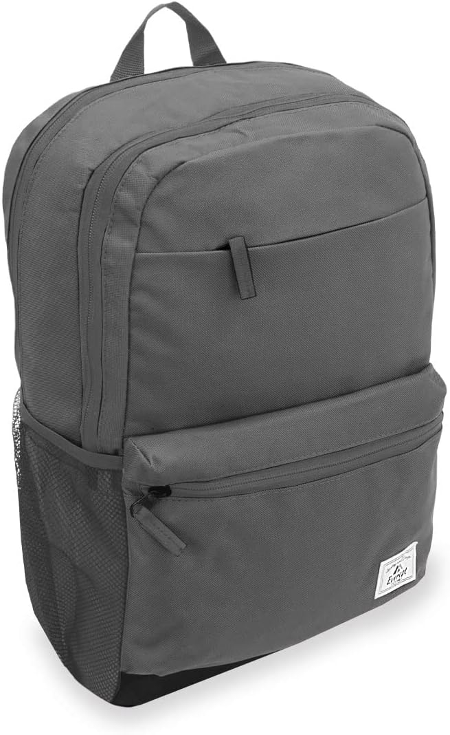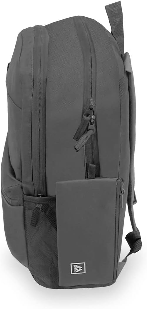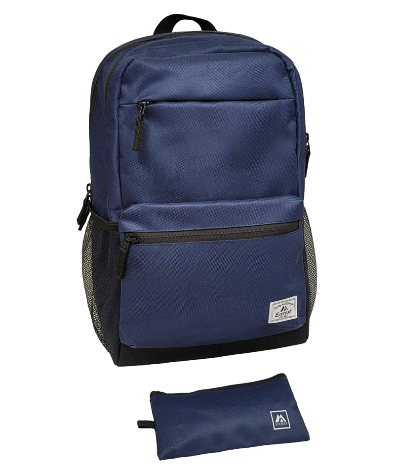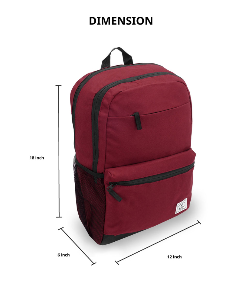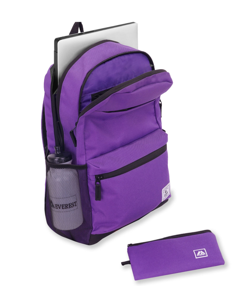 Everest Modern Laptop Backpack, Model BP400LT. Features: Dual compartment backpack. Main compartment includes a padded sleeve for laptops up to 16". Front compartment is small storage area with additional inner zippered compartment. Front zippered pocket with internal organizer. Side mesh pockets for bottle storage or easy stashing. Padded back panel and S-curve padded shoulder straps for comfort. Pencil case included. Colors: Black, Burgundy, Dark Gray, Dark Purple, and Navy. Material 600D Polyester. Dimension 18 x 12 x 6in. Capacity 1200 cu in / 20 L. Weight 1 lbs 8 oz / 0.7 kg.