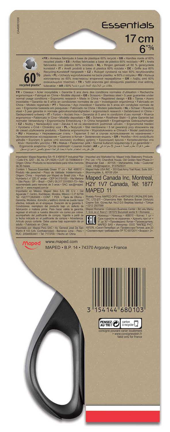 Tijera de oficina de acero inoxidable marca Maped Office Essentials, de tamaño de 8.25 pulgadas, eco amigable, hecha de 60% plastico reciclado.