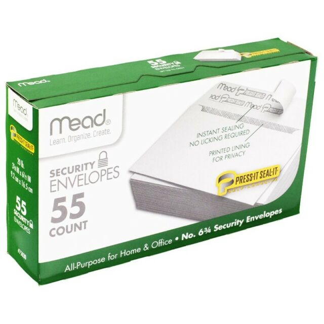 Mead 55 Count, Security White Envelopes. Press-it seal-it self-adhesive, No.6 3/4. 3 5/8in x 6 1/2in. 9.2cm x 16.5cm.