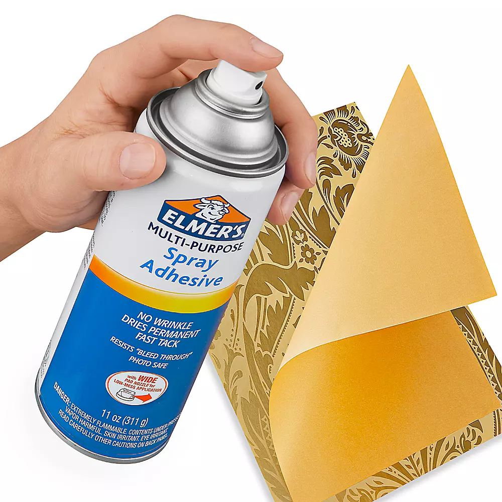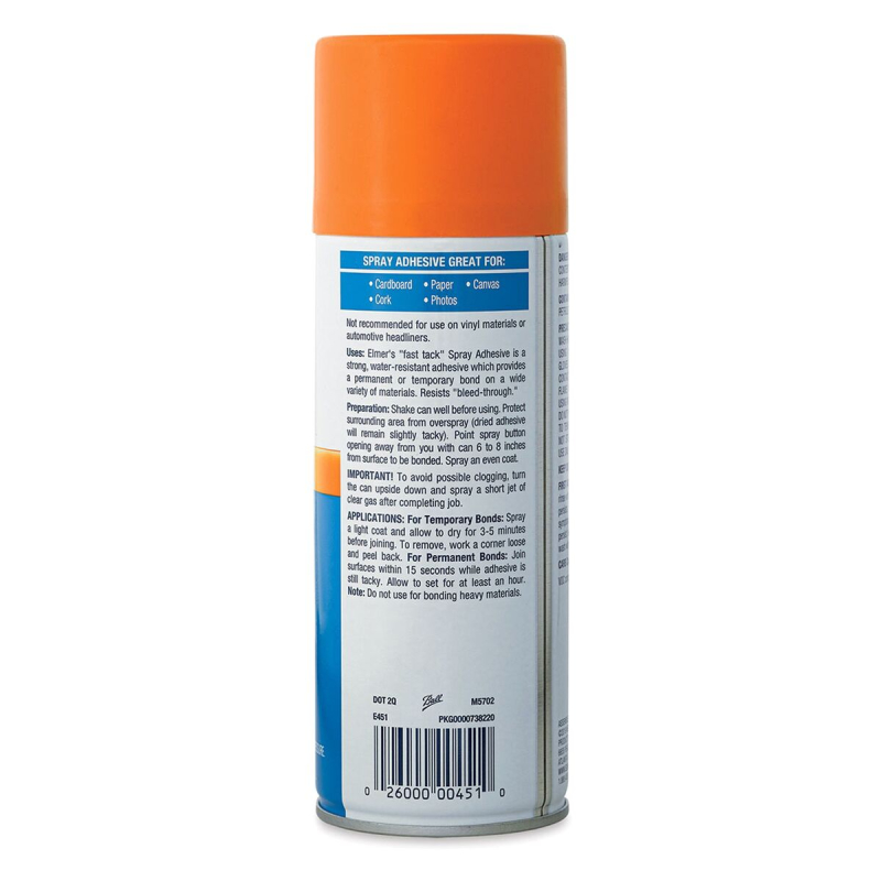 Pegamento Elmer's Multi-Purpose Spray Adhesive de 11 onzas. Se adhiere al papel, corcho, cartón, canvas, fotografías, plástico, papel de aluminio y más. Ideal para reparar articulos en el hogar, hacer manualidades o para proyectos escolares. Con secado rápido. 11oz. Cubre grandes superficies rápidamente. Se seca transparente para un aspecto pulido. Permite reposicionar antes del secado.