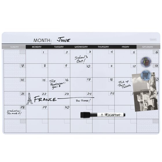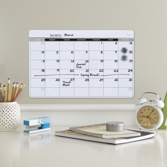 Quartet 79524 11 x 17 in. Magnetic Dry-Erase Calendar, modular, One month calendar with dry-erase pen and two magnets. Gray or White. Crea una presentación de boletín personalizada con este calendario mensual magnético de borrado en seco de 5 semanas sin marco. Esta pizarra fácil de usar tiene una superficie magnética lisa. Incluye marcador de tinta borrable y dos imanes sujetadores. Colores gris o blanco.