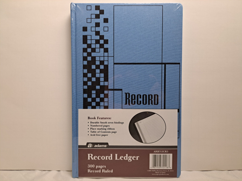 Adams - Registro de Contabilidad (Record Ledger) ARB712CR3, 12-1/8 x 7-5/8 pulgadas (inches), 300 páginas. Cubiertas de tela azul con diseño estampado negro, títulos y lomo. Páginas numeradas. Papel libre de ácido. Cinta de marcado de lugar.