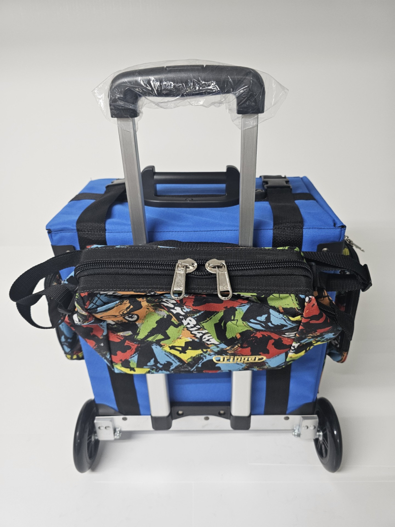 Bulto con ruedas marca Tripper. Hechos en Puerto Rico. Combinación de varios tonos. Cada uno incluye: Una Lonchera con abertura tipo "Wide Mouth" y una cartuchera con hebilla que se adhiere al bulto. Ademas, cada bulto viene equipado con: Dos bolsillos insulados a cada lado. Bolsillos tipo sobre, con zipper al frente. Capacidad de sobre 6 resmas. Correa tipo maleta para colgar cartuchera incluida o un bulto adicional. Sistema "Big Wheel" de dos ruedas grandes traceras para cómodo desplazamiento silencioso y dos ruedas giratorias al frente.